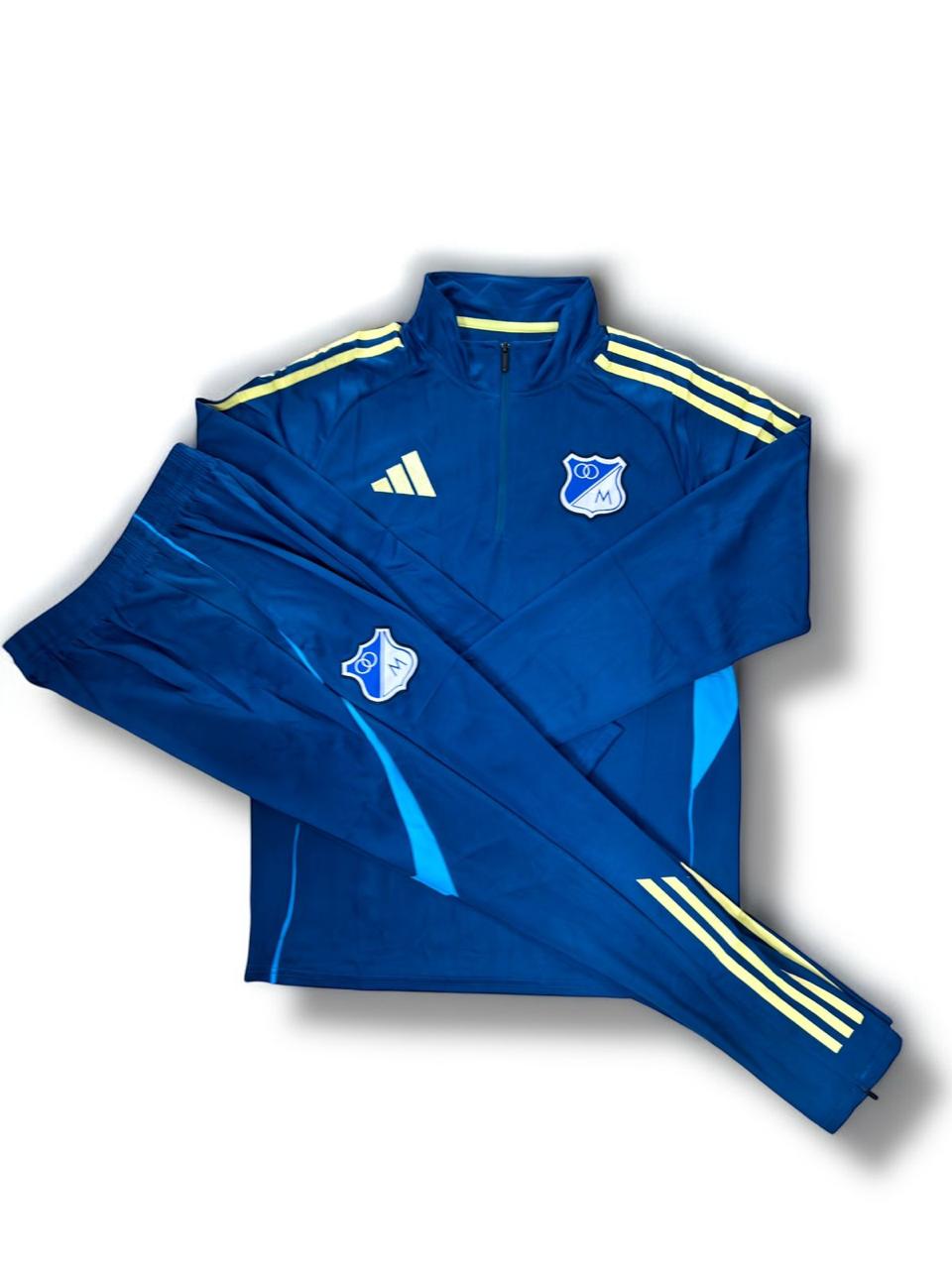 Conjunto deportivo oficial del Club Millonarios F.C., compuesto por chaqueta y pantalón en color azul característico del equipo. Fabricado en material de alta calidad, ofrece comodidad y resistencia para entrenamientos o uso casual. La chaqueta cuenta con cierre frontal de medio cierre, franjas distintivas en los hombros y el escudo del club bordado en el pecho, mientras que el pantalón presenta el escudo en la pierna y detalles en color azul claro y amarillo. Diseño moderno y ajustado que combina estilo y orgullo por tu equipo.